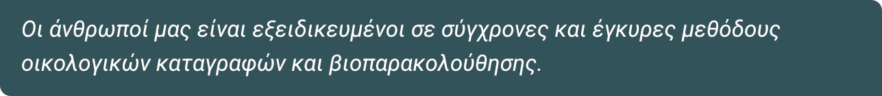 Οι ομάδα μας περιλαμβάνει βιολόγους, περιβαλλοντολόγους και τεχνικούς με ειδικές γνώσεις στην καταγραφή και μελέτη της βιοποικιλότητας.